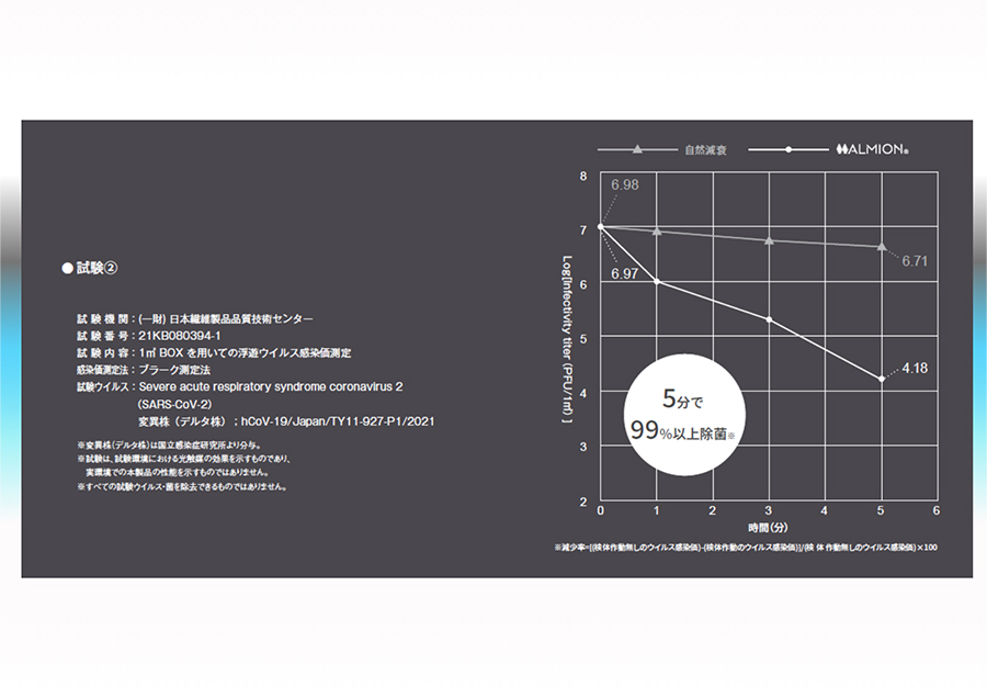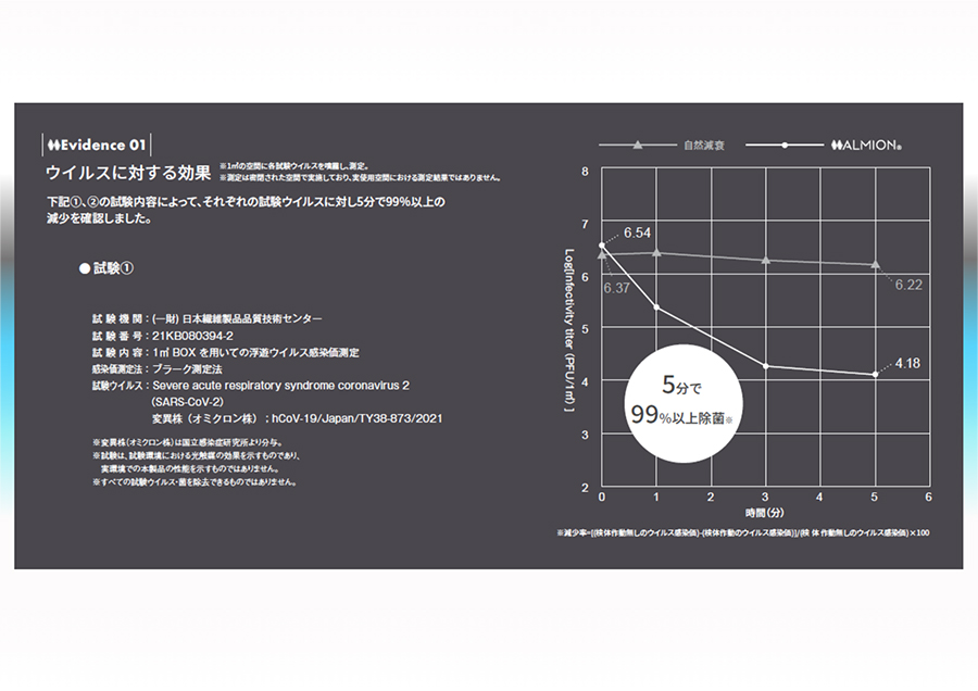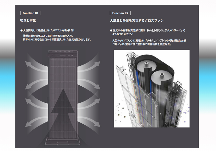 独自の開発技術(ALMION)により、99%以上の臭い、菌・ウイルスを強力分解。分解後は微量の水蒸気と二酸化炭素になり、清潔な空気が排出されます。