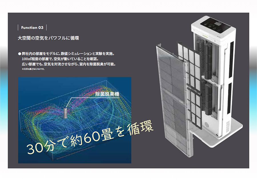 大空間の空気をパワフルに循環、100㎡程度の広い部屋でも空気を対流させながら、室内の除菌脱臭が可能です。(実験結果による)