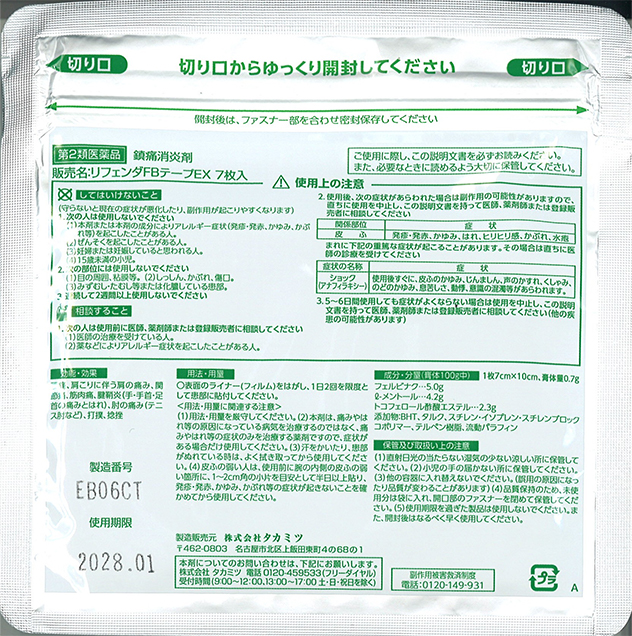 表面のライナー(フィルム)をはがし、1日2回を限度として患部に貼付してください。