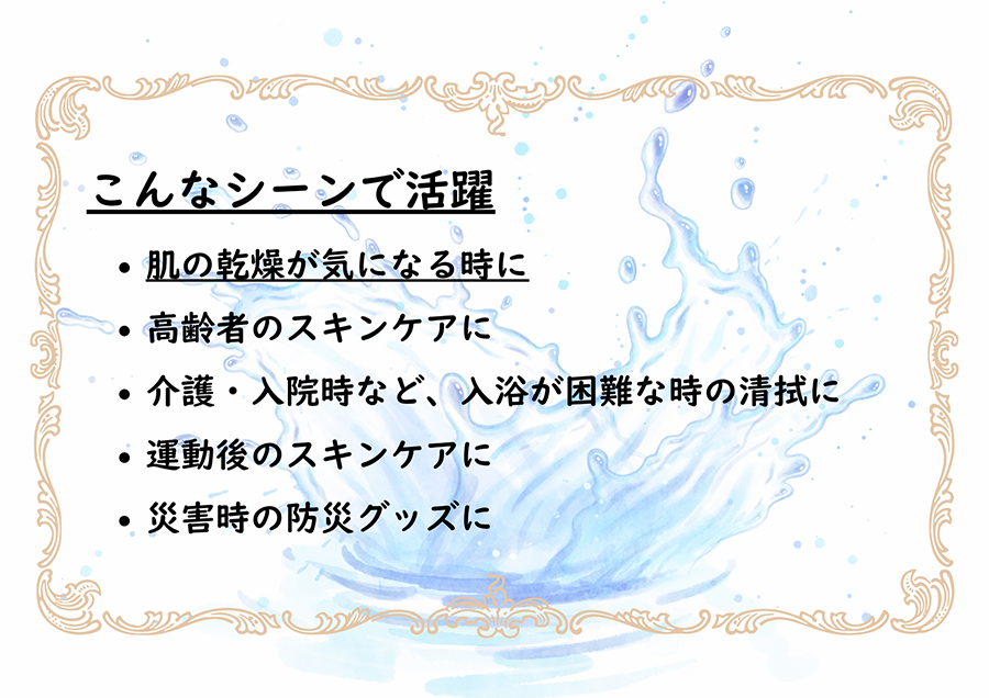 加齢による乾燥肌、皮脂欠乏によるトラブル肌、バリア機能低下の子供のスキンケア、日常の全身スキンケア、髪の毛の保湿 -