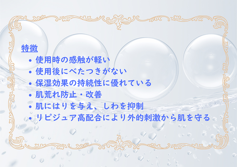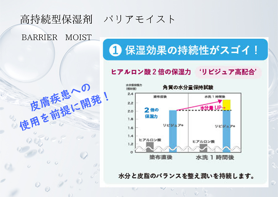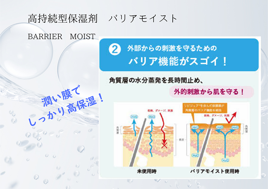 保湿効果の持続性に優れ、肌あれ防止やしわを抑制、外的刺激からお肌を守ります。保湿成分『リピジュア』は化粧品だけでなく、医薬品・人工臓器など幅広い分野で採用。塗布直後よりも水洗1時間後の方が水分保持力がアップします。