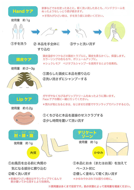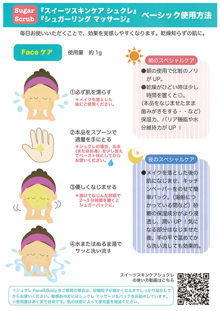 すべてに植物性食品素材を使用し、万が一、口に入っても無害、幅広い方々に使っていただけます。洗顔後の濡れたお肌になじませてサッと洗い流すだけの簡単ケア、お砂糖がお肌の水分と皮脂のバランスを整え、しっかりと保湿をしてくれます。全身に毎日使えるのも魅力です。