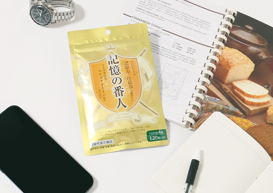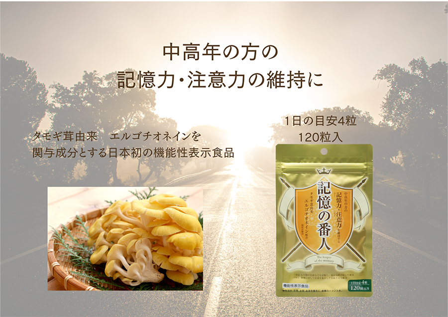 タモギタケエキスには、水溶性のアミノ酸誘導体の一種で強い抗酸化作用を持つ「エルゴチオネイン」が含まれています。抗酸化作用をもつエルゴチオネインは継続的な摂取により、 中高年の方の記憶力(人や物の名前などを記憶し、後から呼び起こす能力)及び注意力(物事に対して注意を集中して持続させる能力)を維持する機能があります。 -