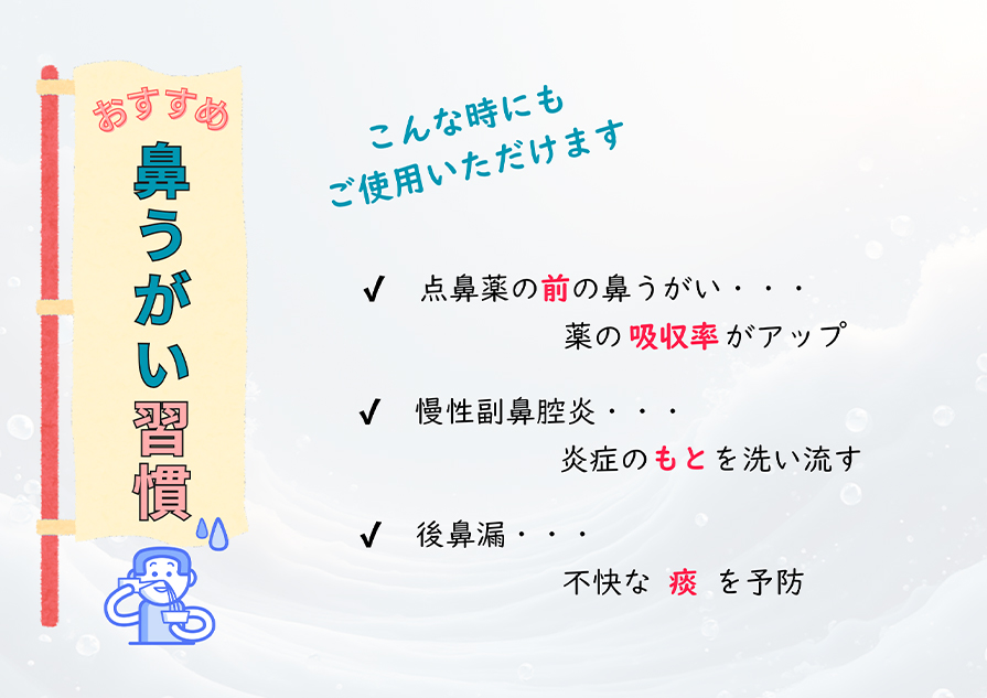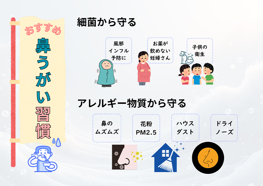 鼻うがいは鼻から生理食塩水を注入して、鼻腔内の鼻水や膿、細菌、花粉などの異物を取り除く方法です。病気の予防や鼻の病気の症状の緩和に効果を期待できる手軽な方法です。
